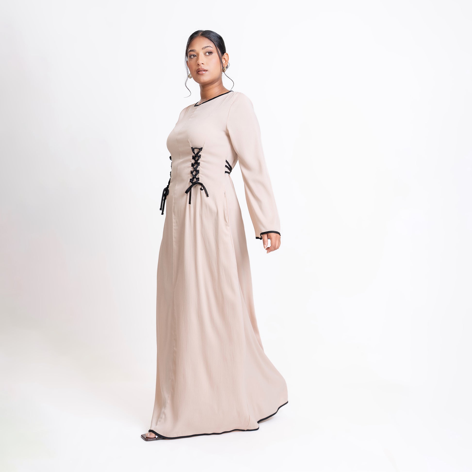 Long flowy modest dress. This dress has pockets. 57 inches in length. Black lace detailing in the neckline, sleeves and hem and a 3-point joint belt at the back