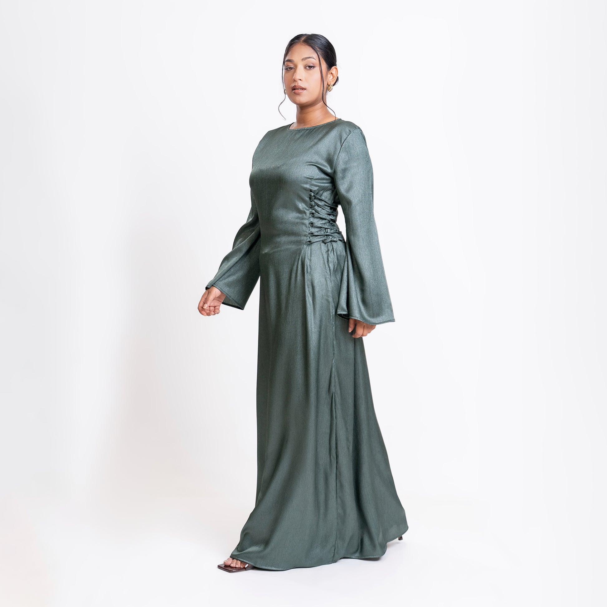 Green shimmer satin side lace-up maxi