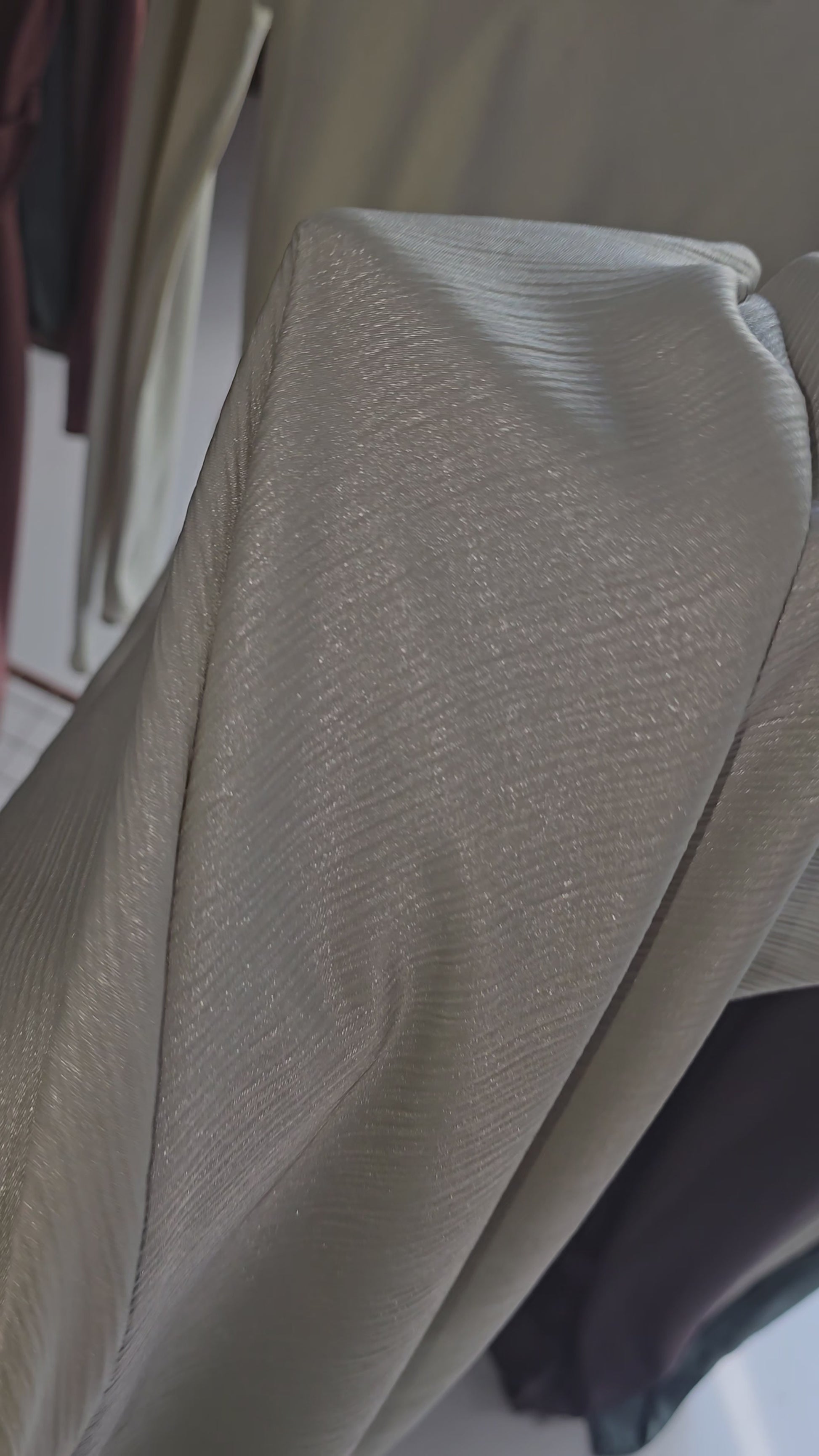 This is a bias cut dress made of shimmery satin fabric. The shimmers show up under light. Comes with a separate belt which can be removed if preferred.
